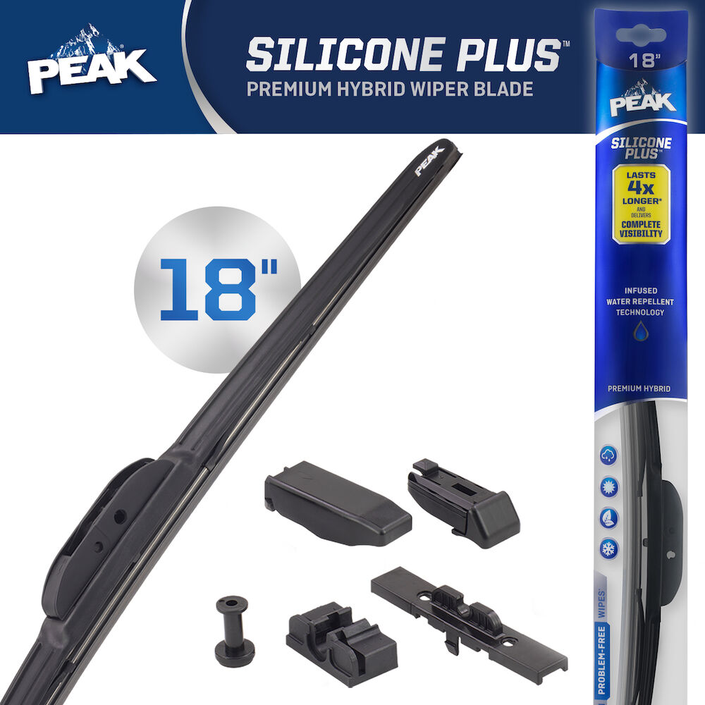 PEAK® SILICONE PLUS™ premium hybrid wiper blades are engineered to last 4X longer* and deliver complete visibility in any weather driving condition. The Tri-layer wiping element is constructed with a silicone compound for longevity providing 2 million problem-free wipes* during the life of the blade. The infused water repellent technology coats the windshield shedding rain and winter road spray. Upgrade to a premium solution to get consistent performance in all seasons with the PEAK® SILICONE PLUS™ wiper blades. These blades are equipped with EZ-SNAP® Universal Connector System to fit most wiper arm styles. Installation is quick and easy with simple to follow instructions inside the package. Blades are available in lengths of 13” to 28”.